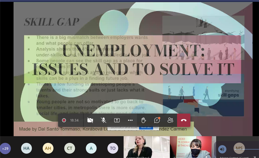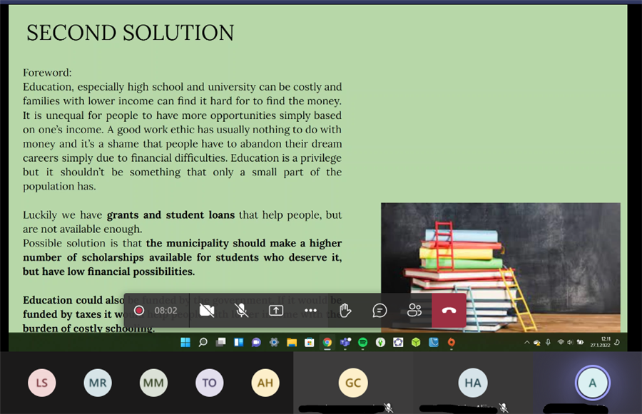 A lo largo de todos estos días hemos estado trabajando en grupos con alumnos de la República Checa, Finlandia e Italia. Entre todos hemos aportado ideas para dar solución a los problemas más acuciantes a los que nuestros jóvenes se están enfrentando o tendrán que enfrentarse en un futuro muy próximo .Hemos expuesto nuestras opiniones, escuchado otras, debatido de manera respetuosa y llegado a acuerdos. En definitiva, ha sido una semana muy productiva en la que nuestros alumnos han escuchado acentos muy diversos, han desarrollado habilidades que sin duda en un futuro les será de gran utilidad y , encima, la tecnología no ha fallado ni un solo día ¿pero qué más se puede pedir?.